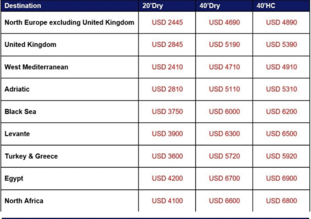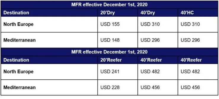 此外,北欧和地中海还将分别增加310美元和296美元的MFR(海洋燃料回收)附加费。