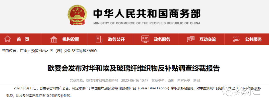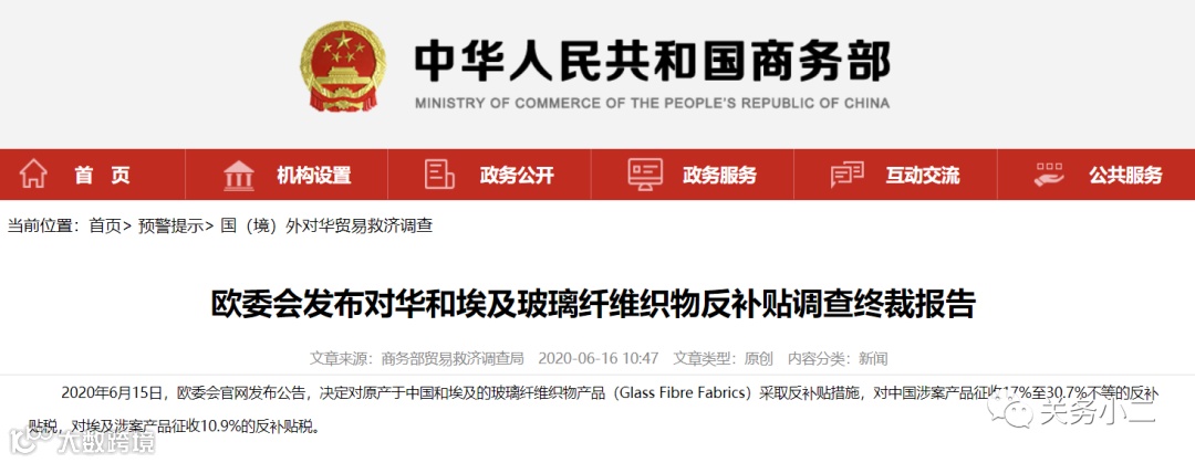 2020年6月15日,欧盟委员会发布公告,对原产于中国和埃及的玻璃纤维织物(Glass Fibre Fabrics)作出反补贴肯定性终裁,决定对埃及涉案产品征收10.9%反补贴税,对中国涉案产品征收17.0%-30.7%反补贴税。