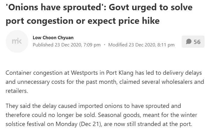 由于拥堵加剧,多家批发商和零售商称,巴生港西港的集装箱拥堵导致,交货延误超过一个月,增加了不必要的成本。因延误导致进口的洋葱已经开始发芽,无法进行出售,要小心弃货了。
