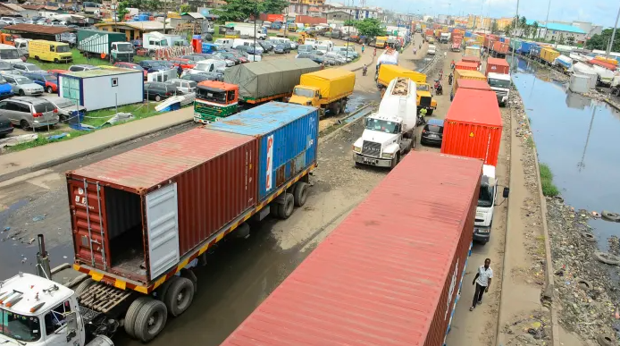 尼日利亚拉各斯的Apapa港口排队的货车,海岸附近货船等待一个多月才能在港卸货