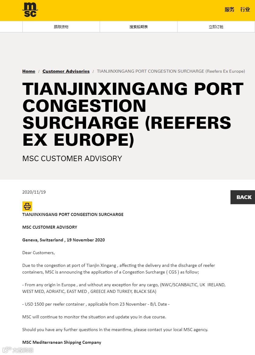 由于新港的拥堵,影响了冷藏集装箱的交付,MSC将对从欧洲、加拿大、美国、墨西哥、中美洲和加勒比海地区,到新港的冷藏货物收取拥堵附加费(CGS)。