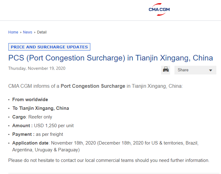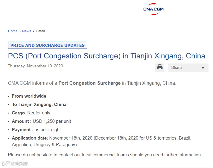 CMA CGM关于中国天津新港的港口拥堵费: