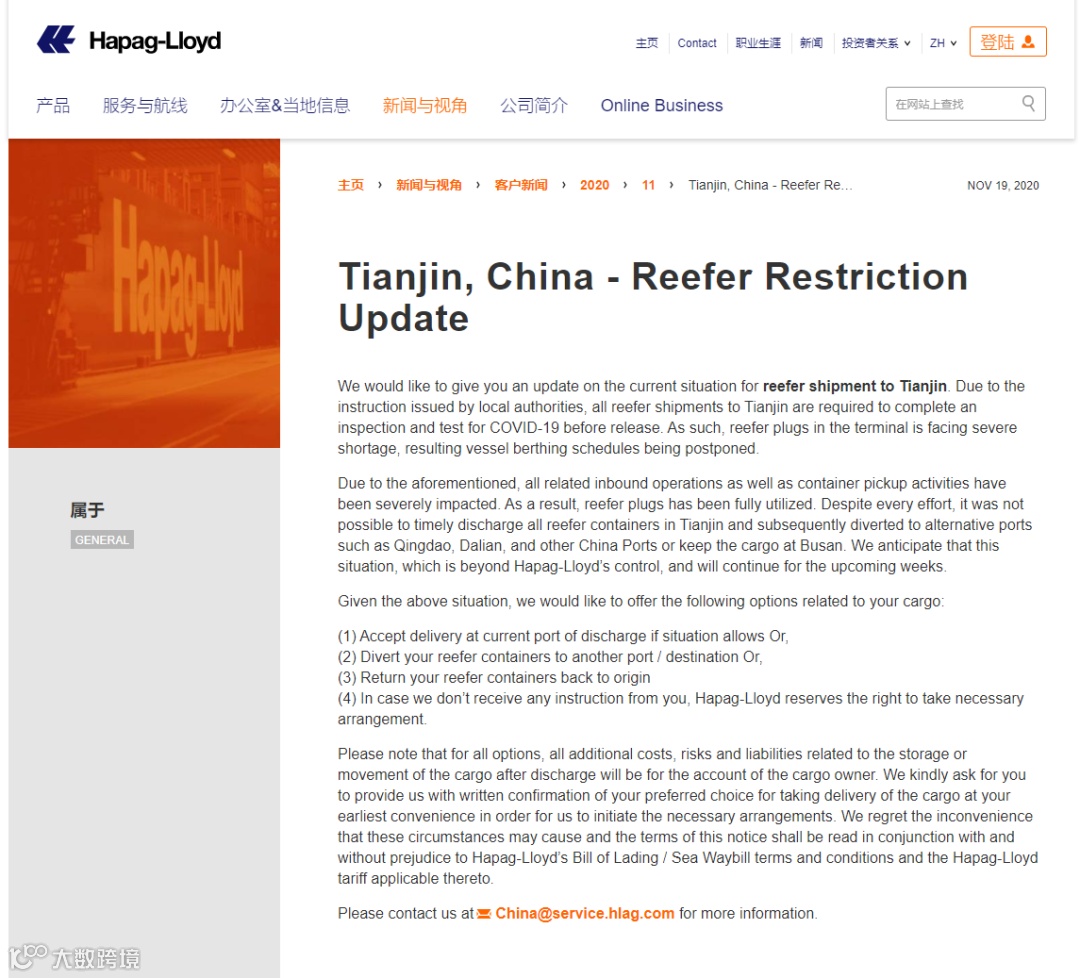 据赫伯罗特日前的客户通知表示,由于地方当局的指示,所有运往天津的冷藏箱都必须在放行前完成对Covid-19的检查和测试,冷柜的积压导致码头的冷藏箱插头严重短缺,并且船舶停泊时间被推迟。