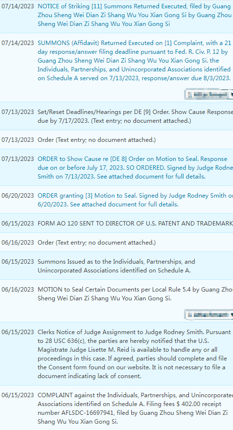 SUMMONS (Affidavit) Returned Executed on [1] Complaint, with a 21 day response/answer filing deadline pursuant to Fed. R. Civ. P. 12 by Guang Zhou Sheng Wei Dian Zi Shang Wu You Xian Gong Si. the Individuals, Partnerships, and Unincorporated Associations identified on Schedule A served on 7/13/2023, response/answer due 8/3/2023.