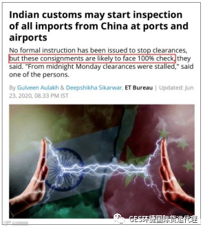 近日印度的疫情开始爆发了,与此同时,中印近日爆发冲突不断,中印关系紧张升级。提醒外贸货代朋友们近期多加关注外贸物流影响,有贸易往来的谨慎出货。据印度媒体报答和行业人士透露,鉴于中印近期发生的一系列事情,中印贸易成为了印度对准的苗头,印度媒体发起来抵制中国产品的运动。 印度海关暂停中国货物清关,对所有中国货物实施100%检查