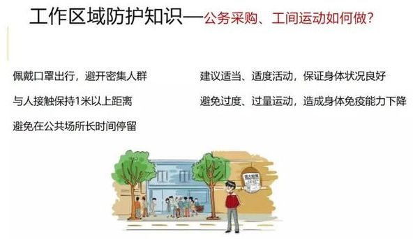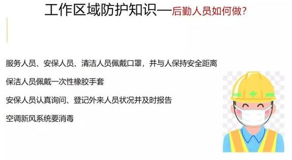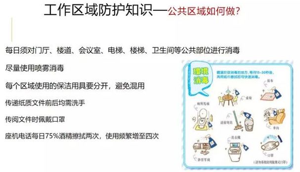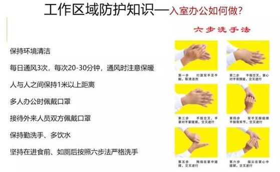 保持办公区环境清洁,建议每日通风3次,每次20-30分钟,通风时注意保暖。人与人之间保持1米以上距离,多人办公时佩戴口罩。保持勤洗手、多饮水,坚持在进食前、如厕后按照六步法严格洗手。接待外来人员双方佩戴口罩。