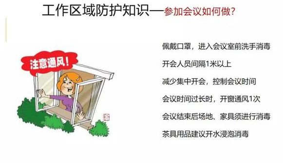 建议佩戴口罩,进入会议室前洗手消毒。开会人员间隔1米以上。减少集中开会,控制会议时间,会议时间过长时,开窗通风1次。会议结束后场地、家具须进行消毒。茶具用品建议开水浸泡消毒。