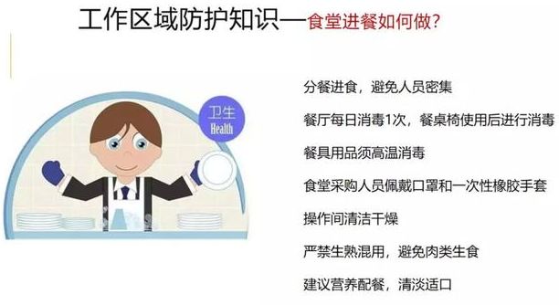 采用分餐进食,避免人员密集。餐厅每日消毒1次,餐桌椅使用后进行消毒。餐具用品须高温消毒。操作间保持清洁干燥,严禁生食和熟食用品混用,避免肉类生食。建议营养配餐,清淡适口。