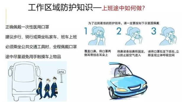 正确佩戴一次性医用口罩。尽量不乘坐公共交通工具,建议步行、骑行或乘坐私家车、班车上班。如必须乘坐公共交通工具时,务必全程佩戴口罩。途中尽量避免用手触摸车上物品。
