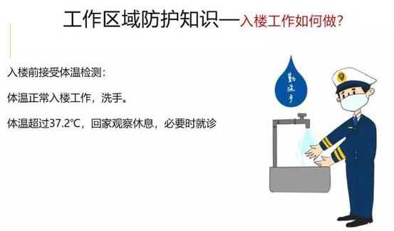 进入办公楼前自觉接受体温检测,体温正常可入楼工作,并到卫生间洗手。若体温超过37.2℃,请勿入楼工作,并回家观察休息,必要时到医院就诊。