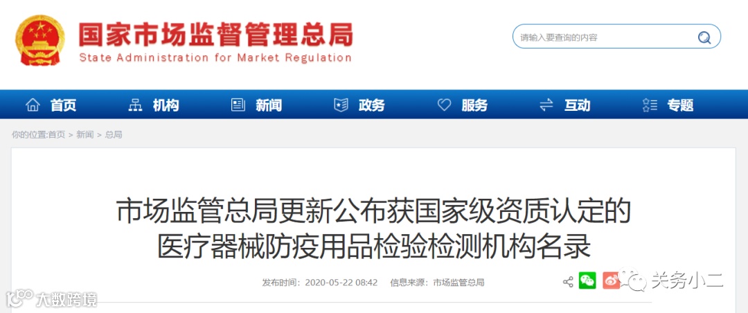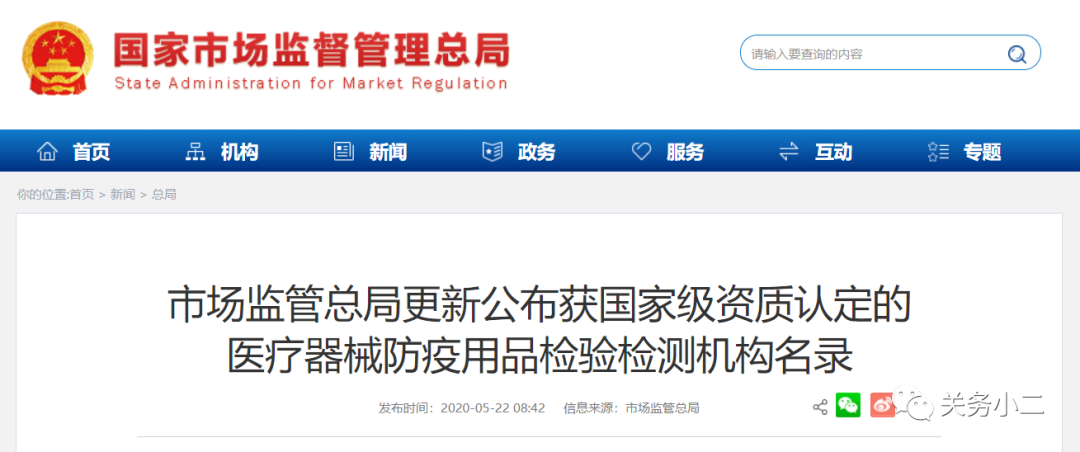 为进一步加强防疫物资质量安全监管,充分发挥检验检测在疫情防控中的技术保障作用,满足对防疫物资检验检测的需要,现将通过国家认证认可监督管理委员会审批取得资质认定的医疗器械防疫用品检验检测机构名录集中予以更新公布(具体名单附后)。
