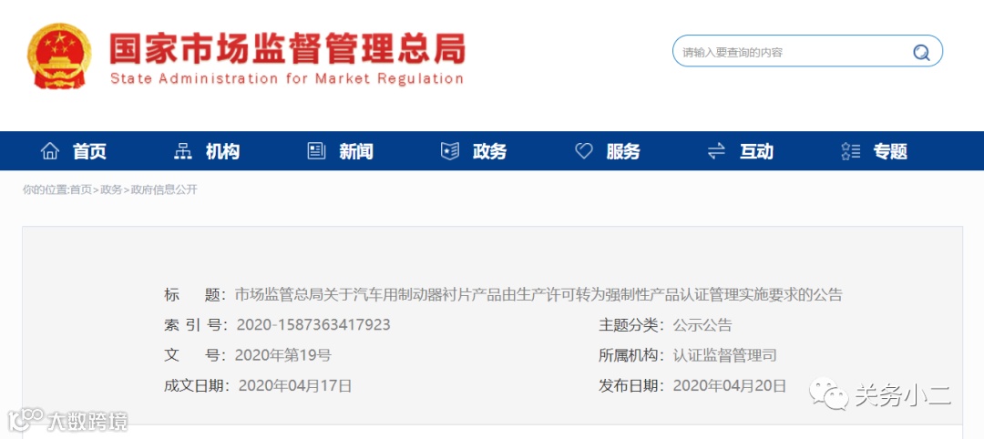 根据《国务院关于调整工业产品生产许可证管理目录加强事中事后监管的决定》(国发〔2019〕19号)要求,市场监管总局对汽车用制动器衬片产品由生产许可转为强制性认证(CCC认证)管理。为确保CCC认证实施顺利,工作衔接平稳有序,现将有关要求公告如下: