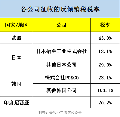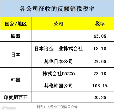 对各公司征收的反倾销税税率如下: