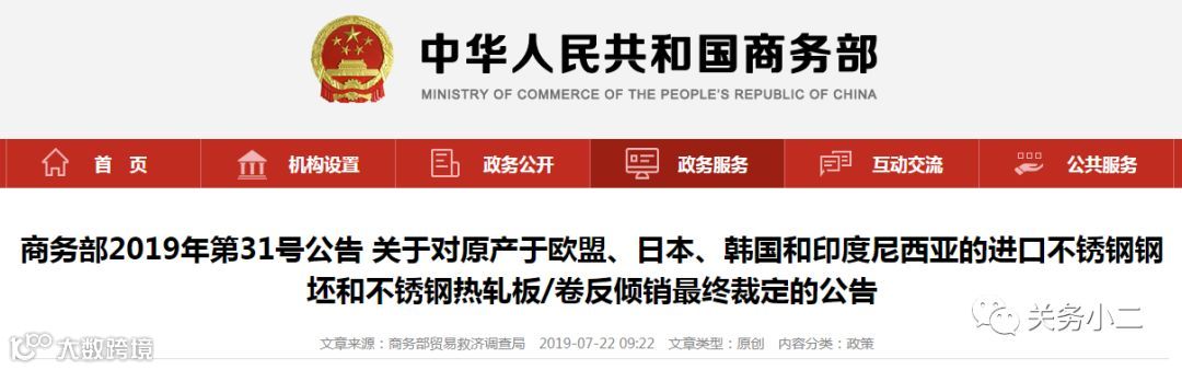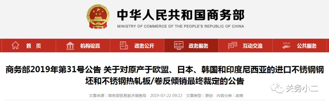 对原产于欧盟、日本、韩国和印度尼西亚的进口不锈钢钢坯和不锈钢热轧板/卷征收反倾销税或价格承诺的实施期限自2019年7月23日起5年。