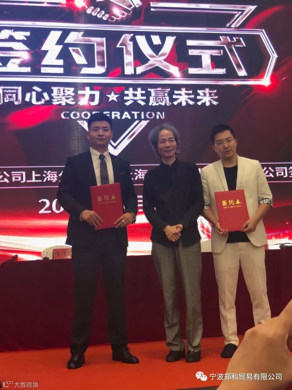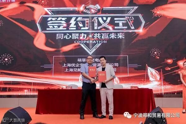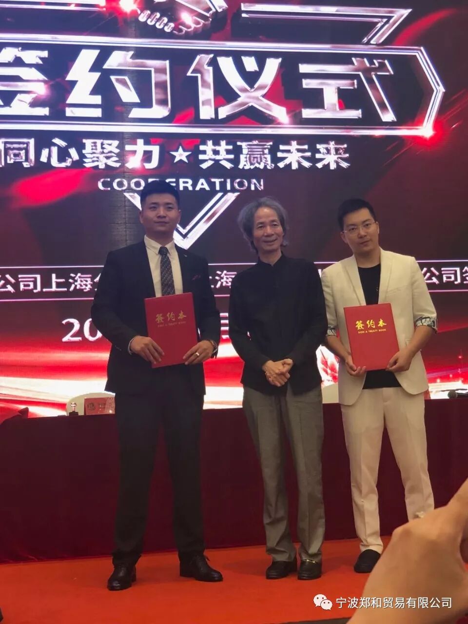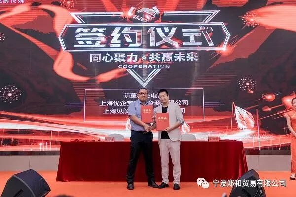 宁波郑和贸易有限公司上海分公司与上海见解文化传媒达成战略合作,郑和贸易董事长游纪见与见解传媒CEO刘星,在会议现场进行了签约仪式。