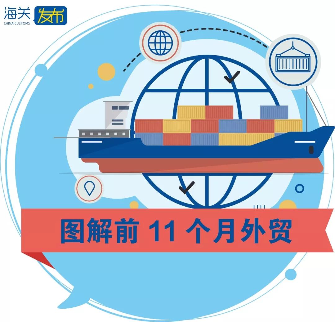 据海关统计,今年前11个月,我国货物贸易进出口总值28.5万亿元人民币,比去年同期(下同)增长2.4%。其中,出口15.55万亿元,增长4.5%;进口12.95万亿元,与去年同期基本持平;贸易顺差2.6万亿元,扩大34.9%。