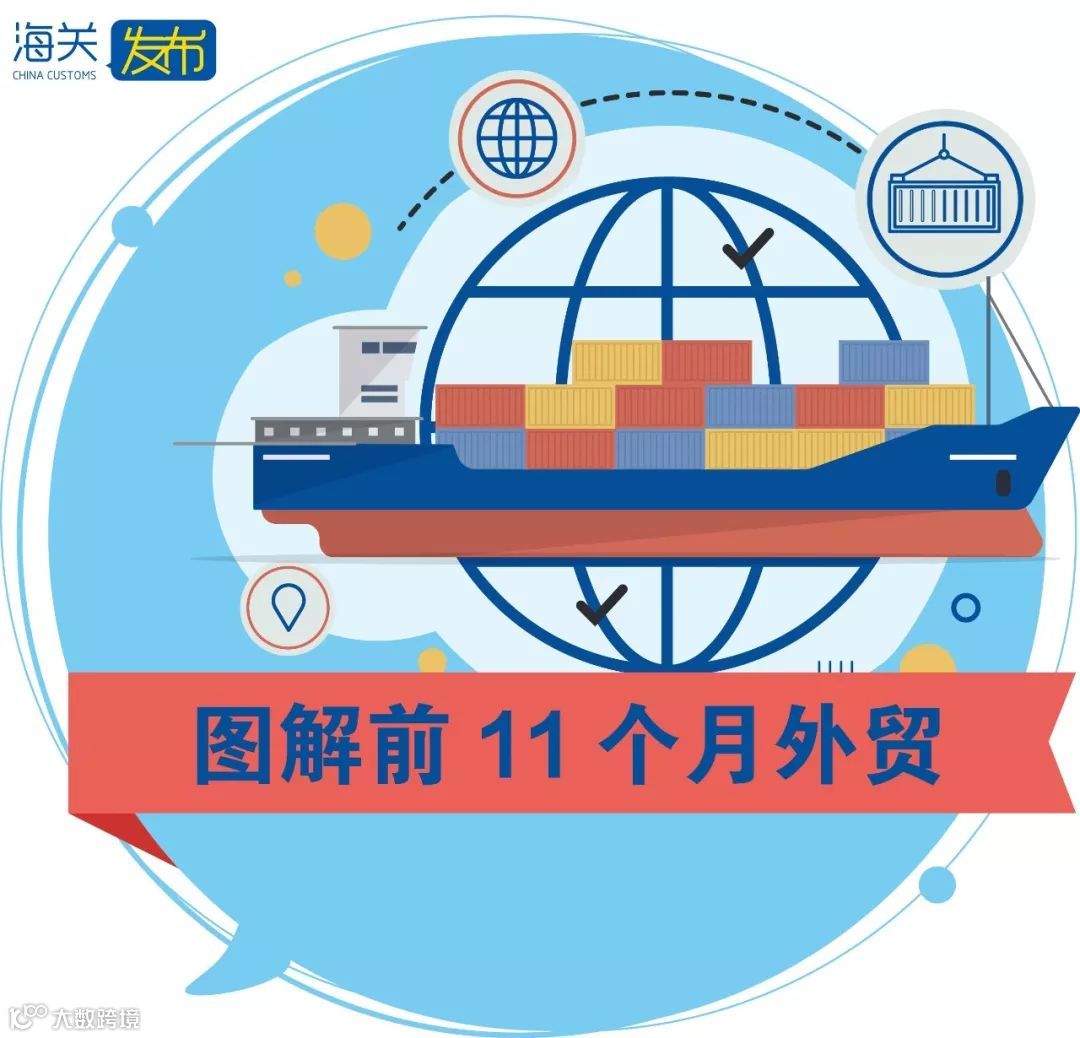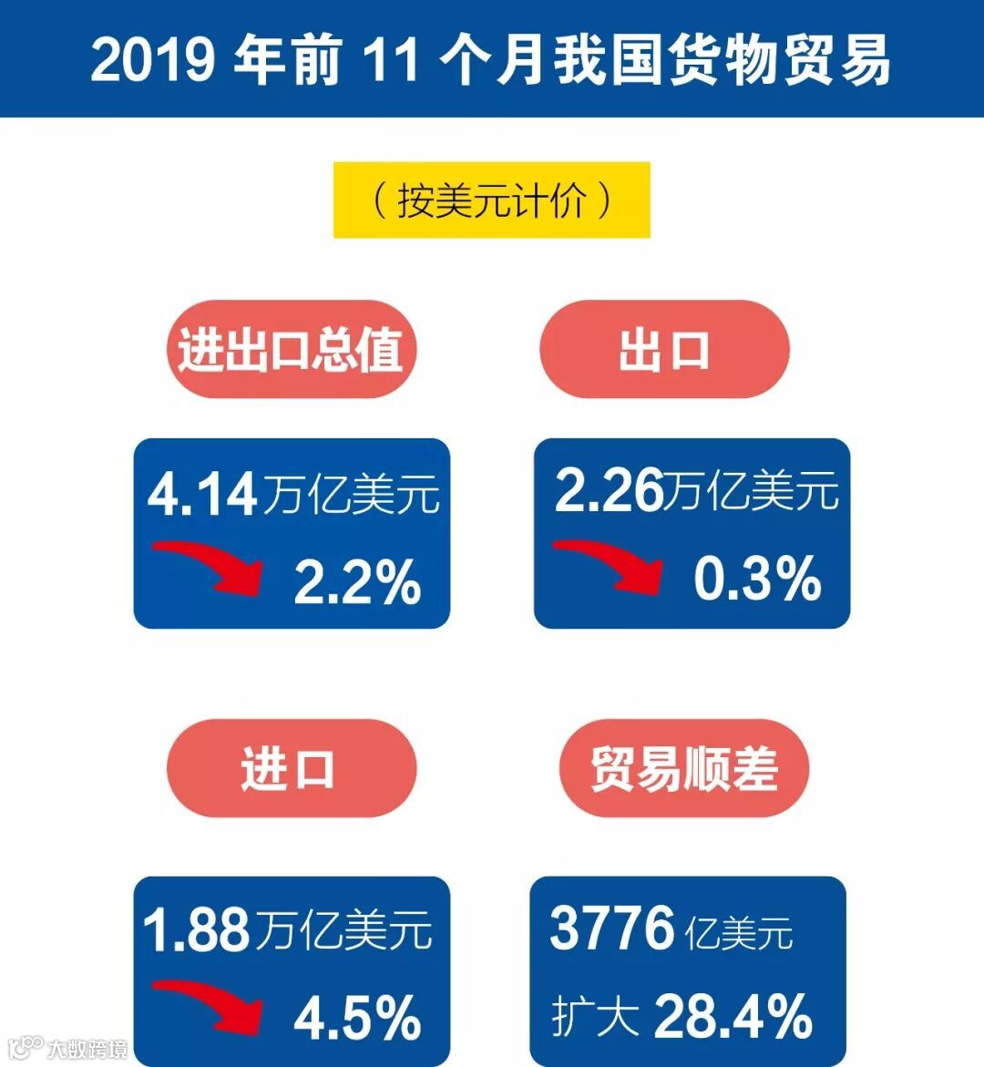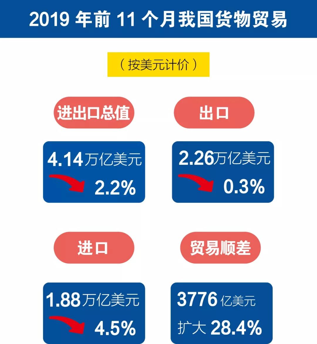 按美元计价,前11个月,我国进出口总值4.14万亿美元,下降2.2%。其中,出口2.26万亿美元,下降0.3%;进口1.88万亿美元,下降4.5%;贸易顺差3776亿美元,扩大28.4%。