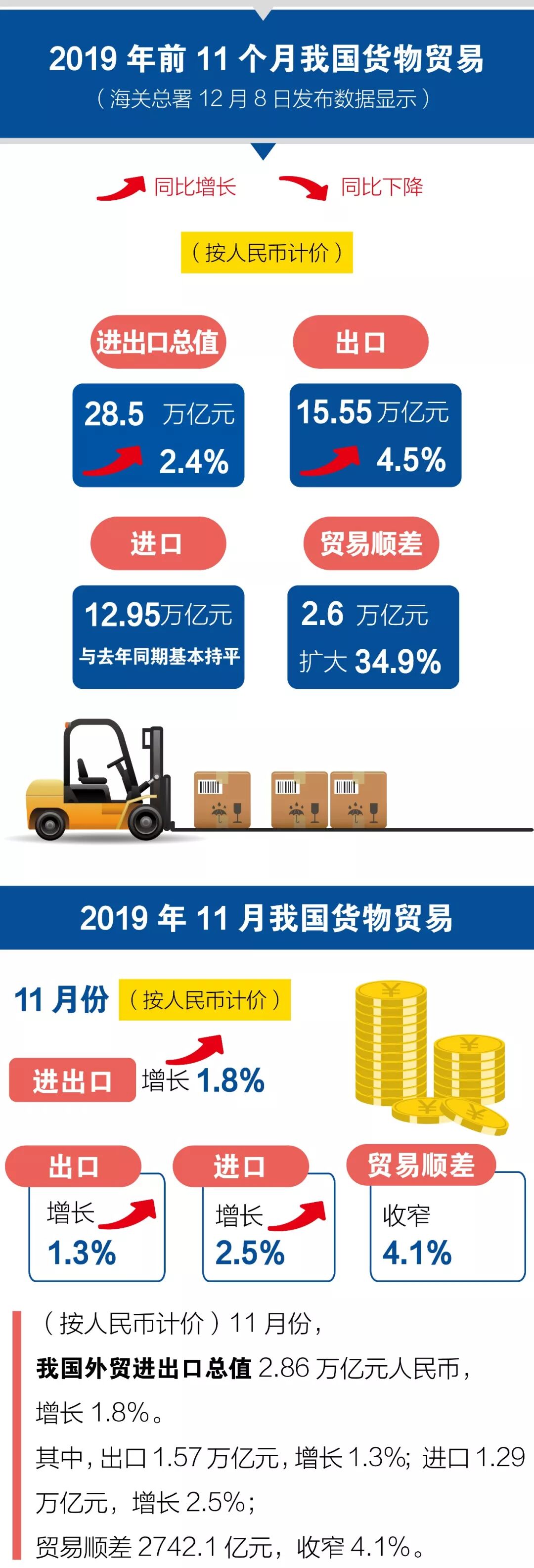 11月份,我国进出口总值2.86万亿元,增长1.8%。其中,出口1.57万亿元,增长1.3%;进口1.29万亿元,增长2.5%;贸易顺差2742.1亿元,收窄4.1%。