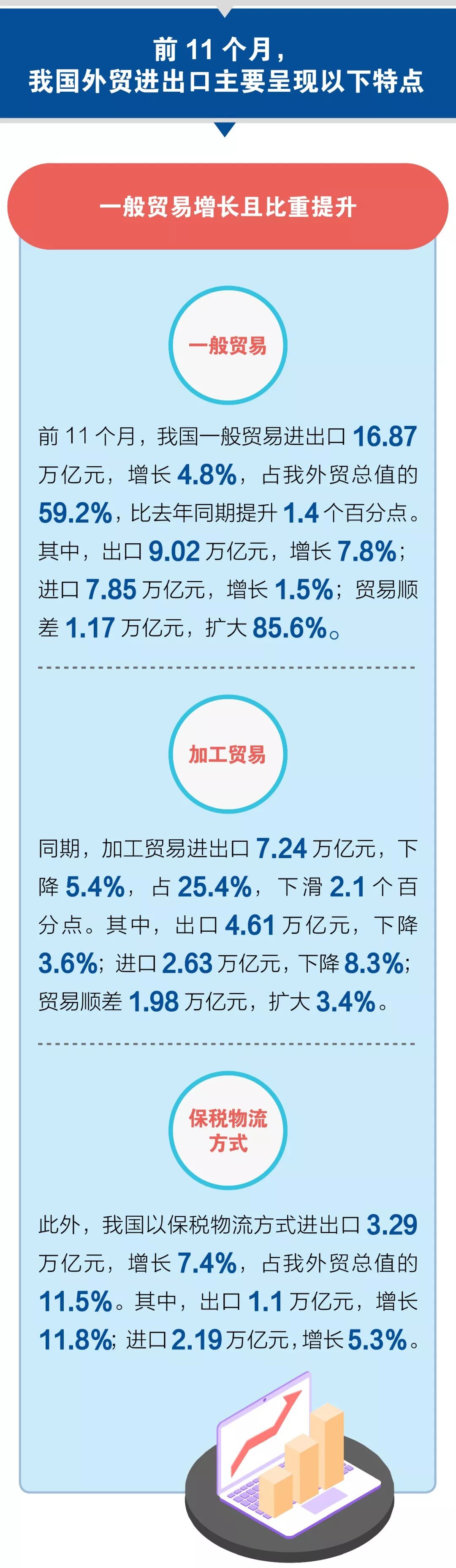 一般贸易增长且比重提升。前11个月,我国一般贸易进出口16.87万亿元,增长4.8%,占我外贸总值的59.2%,比去年同期提升1.4个百分点。其中,出口9.02万亿元,增长7.8%;进口7.85万亿元,增长1.5%;贸易顺差1.17万亿元,扩大85.6%。同期,加工贸易进出口7.24万亿元,下降5.4%,占25.4%,下滑2.1个百分点。其中,出口4.61万亿元,下降3.6%;进口2.63万亿元,下降8.3%;贸易顺差1.98万亿元,扩大3.4%。此外,我国以保税物流方式进出口3.29万亿元,增长7.4%,占我外贸总值的11.5%。其中,出口1.1万亿元,增长11.8%;进口2.19万亿元,增长5.3%。