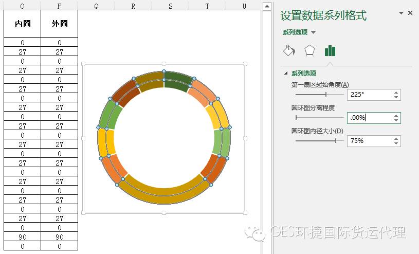通过插入“饼图 >> 圆环图”来模拟仪表盘,注意:需要将两个圆环的“第一扇区起始角度”设置为:225°,并将“内圈”背景和边框颜色去掉,同时也将“外圈”最下方90°区间背景设置为无色或白色。
