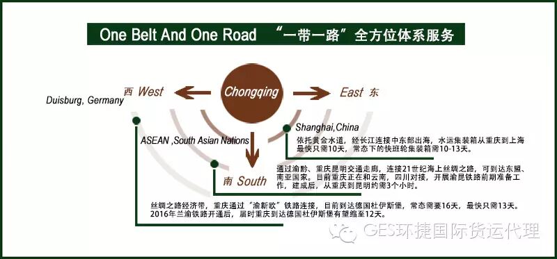 环捷重庆引领 "渝新欧线" 新风尚 重庆雄踞中国西南地区腹地,连接"一带一路"和长江经济区域,同时是长江上游地区非常重要的多式联运综合交通枢纽,它连接东南西北,在地理位置中扮演着至关重要的角色。链接西南,重庆开放欧亚国际铁路,连接欧洲和中亚国家,从重庆到德国的杜伊斯堡仅仅需要16天。链接东部,通过长江黄金水道直达上海港。链接南部,通过渝黔、渝昆铁路直达东盟和南亚国家。 |