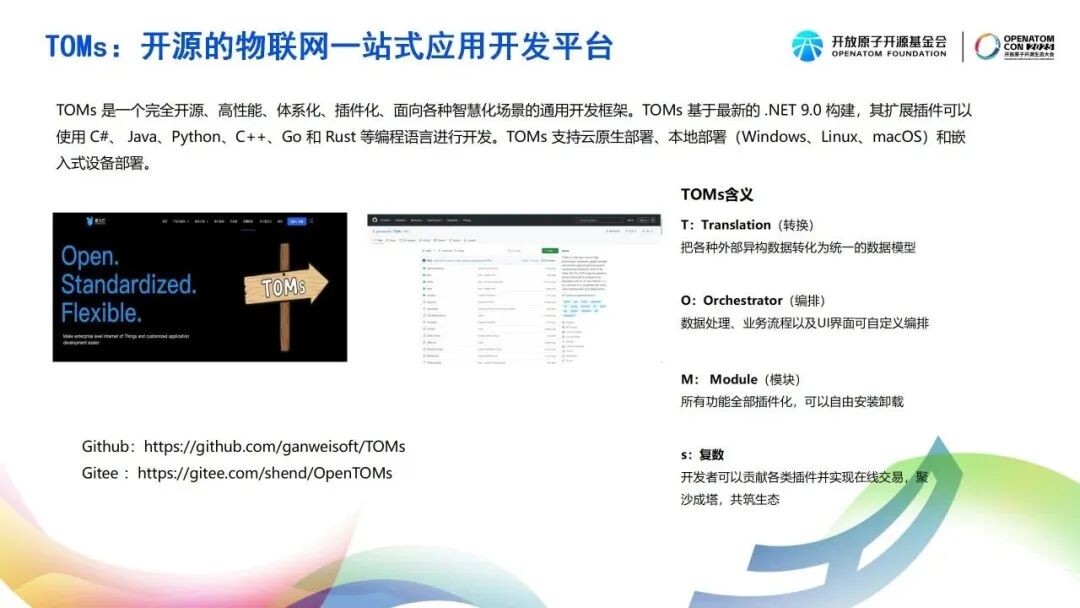作为社区发展的核心驱动力,“开源+”模式正加速产业创新融合,一批优秀企业的入驻为生态建设注入强劲动能。其中,敢为公司开源通用开发框架TOMs,以高性能、体系化、插件化方式链接各类智慧化场景,为社区构建“技术—场景—产业”闭环提供了实践样板。在此基础上,团队持续深耕开源基础设施建设、开发者服务优化及开源项目孵化运营,逐步构建起多维协同的开源生态体系。