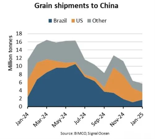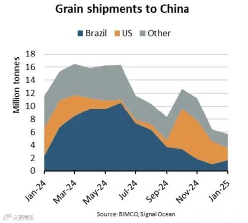 巴西和美国受中国谷物进口需求下降的影响最为严重。根据BIMCO的数据,巴西出口到中国的谷物占中国总谷物出口量的近一半,1月份巴西的谷物货运量同比下降了29%。而美国通常供应中国约五分之一的谷物,其在1月份受到的冲击更大,对中国出口同比下降了57%。