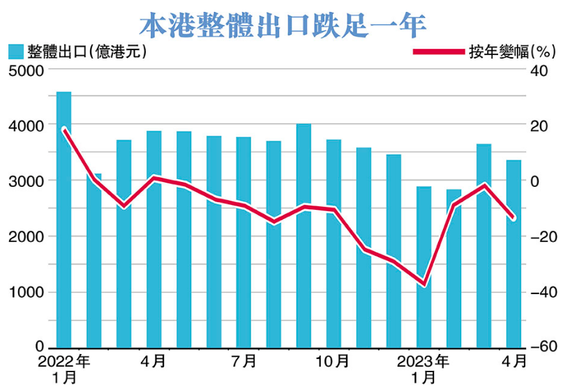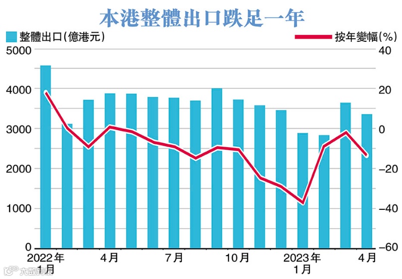 就4月香港出口跌幅扩大,政府发言人昨指出,4月商品出口货值按年进一步下跌,主要受累输往内地、美国及欧盟的出口均减少,同时输往其他主要亚洲市场的出口录得不同程度的跌幅。展望未来,先进经济体疲弱,将继续令香港出口表现受压,尽管预期内地经济加快复苏应可缓解部分压力。