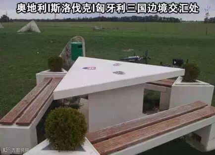 绿茵茵的草坪上有一个三角形的野餐桌,桌面的三边分别印上了三国的国徽,在此进行高端会晤真是再适合不过了! 毕竟打麻将永远凑不齐4个人!