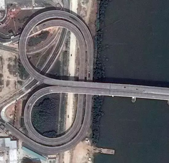 这个不能算国界,只能说是一条奇葩分界线!当一条右行车道和左行车道相遇怎么办?在澳门和珠海横琴岛之间的莲花大桥上,来自大陆的车辆需要在桥下的一条形状如同部分四叶草的路上兜一大圈,才能换车道。看看图就知道多复杂了吧!