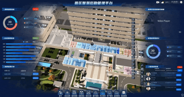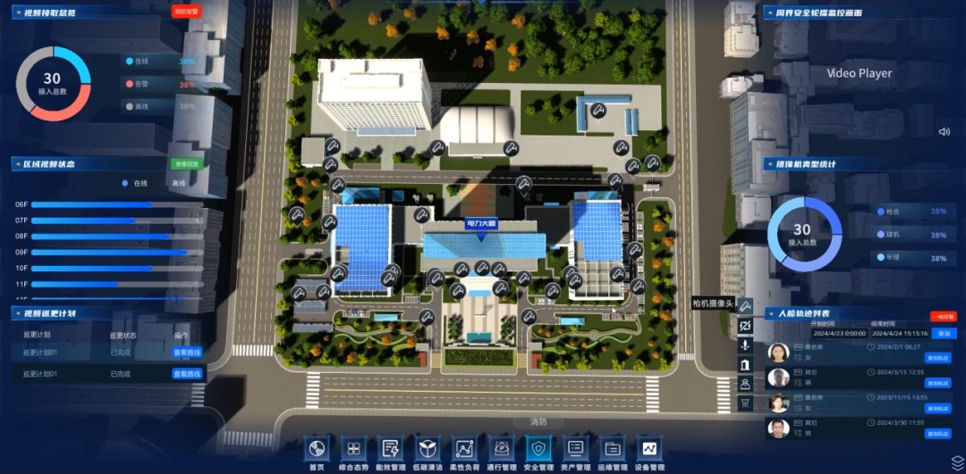 以园区安全管理为例,通过接入各个子系统数据,IOC智慧运营中心能够实现安防核心数据的全面可视化,如消防点位,人脸轨迹、区域视频状态、视频巡更、周界防护等,方便管理者快速掌握园区整体安全情况。