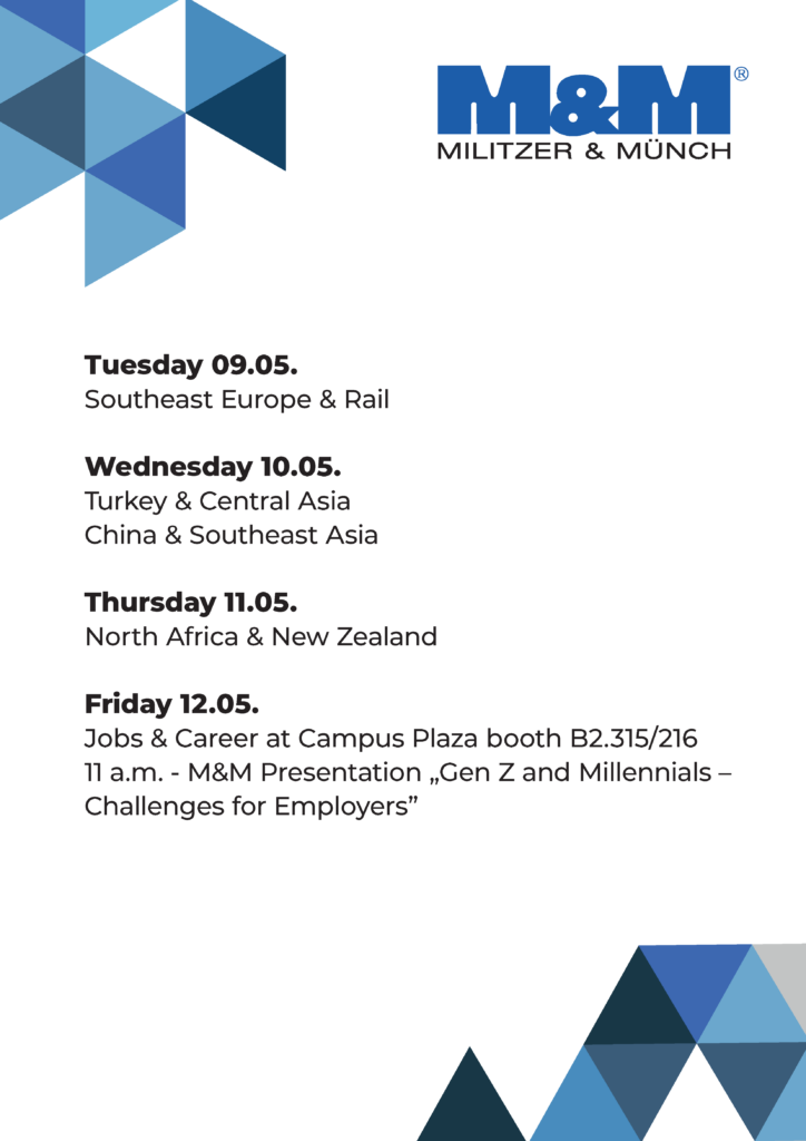 Friday May 12, Jobs & Career was the topic at the new transport logistic Campus Plaza; here established companies and startups present themselves at booth B2.215/314. Eva-Charlotte Dürr, M&M Group Project Manager Pharmaceuticals/Aviation, talked about the latest trends in the world of work for employers and career opportunities in the logistics industry in her presentation “Generation Z and the Millennials – Challenges for Employers”.