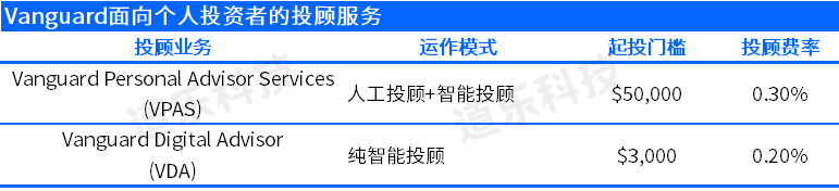 Vanguard为个人投资者提供的投顾服务主要有两种模式:Vanguard Personal Advisor Services(VPAS)和Vanguard Digital Advisor(VDA)。VPAS是“人工投顾+智能投顾”的混合模式,对5万美金以上的客户开放。VDA则是纯智能投顾模式,起投门槛也相对更低(3000美金)。