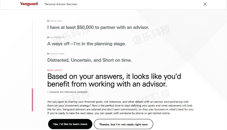 国外(除了传统人工投顾)做得比较好的是Vanguard,它也能够为客户提供从客户自身立场出发定制的投资方案,包括资产配置建议、投资目标拆解(每个月要投多少)、推荐储蓄目标、养老金规划等,从储蓄、投资和税务等方面为客户提供全面的投资建议。