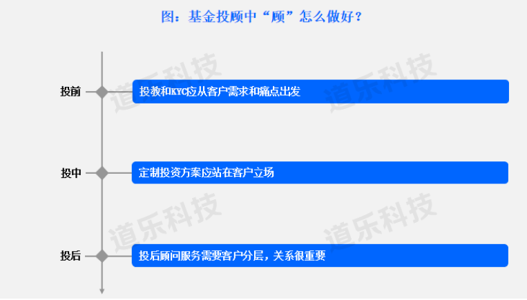 从投资者的角度看,除标准化的运作报告以外,不同类型的投资者对于投后顾问有不同需求。有的人希望得到一些投资工具的辅助,有的人希望定期得到一些投资建议,还有的人更希望与真人投资顾问交流和探讨。