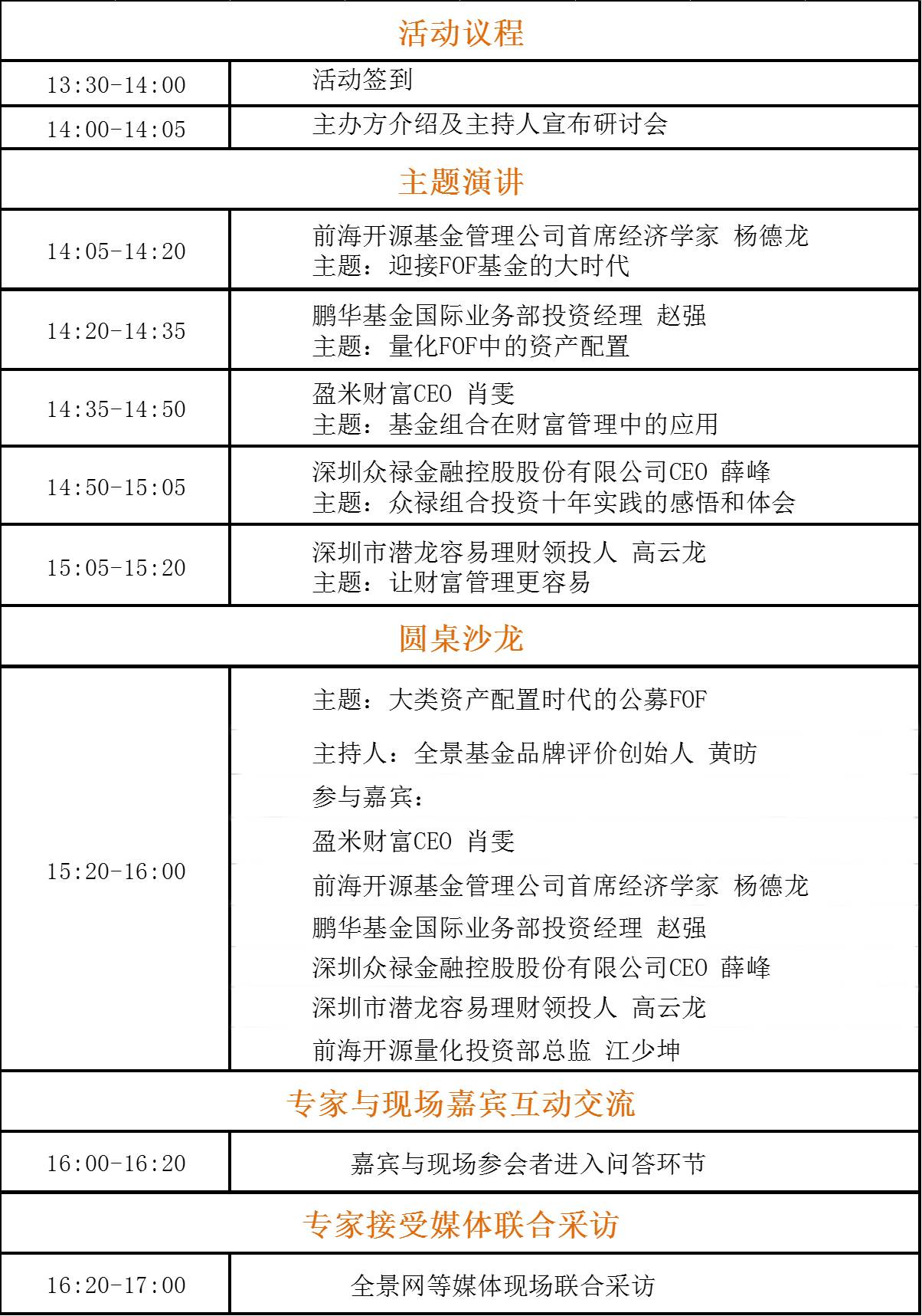 公募FOF征求意见稿近期已出台,资本市场上FOF的热度空前高涨。8月31日下午2:00-5:00,全景网、路演天下与容易理财在全景深圳路演中心主办"基金组合(FOF)与财富管理创新发展研讨会",旨在研究FOF(基金中的基金)、基金组合配置投资对财富管理行业的深刻影响。届时,盈米财富肖雯、前海开源杨德龙、鹏华基金王咏辉、众禄金融薛峰等嘉宾将与投资界人士、媒体等业内人士在现场及网上进行互动交流
