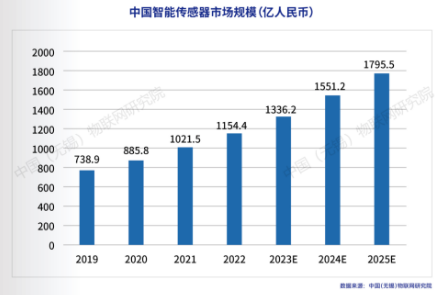 据中国(无锡)物联网研究院数据显示,近年来,我国智能传感器市场规模快速增长,从 2019 年的783.9亿元上升至2022年的1154.4 亿元,到2025年,有望达到1795.5亿元,预计未来3年年均复合增长率约为15.86%。