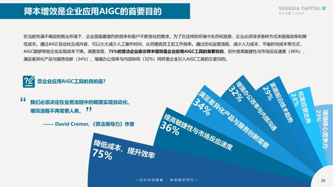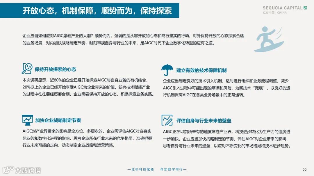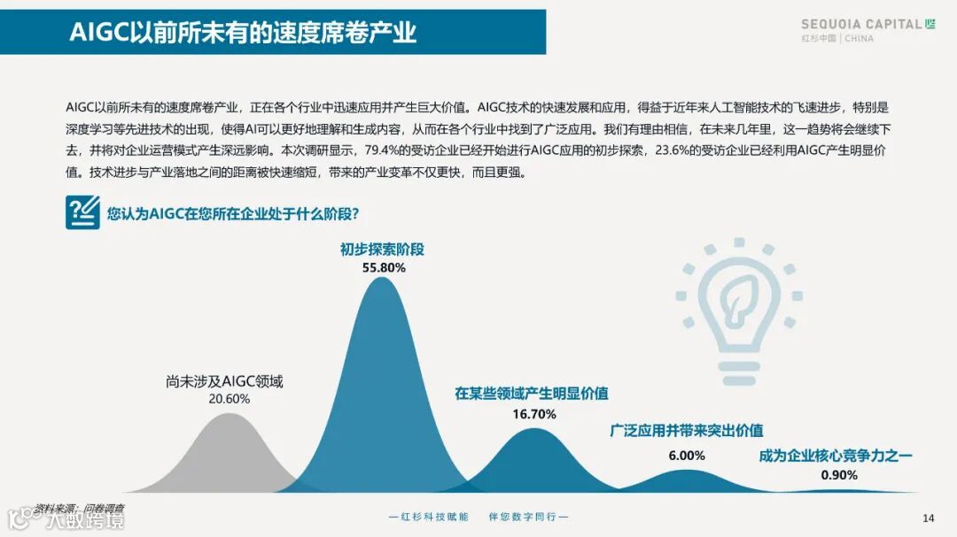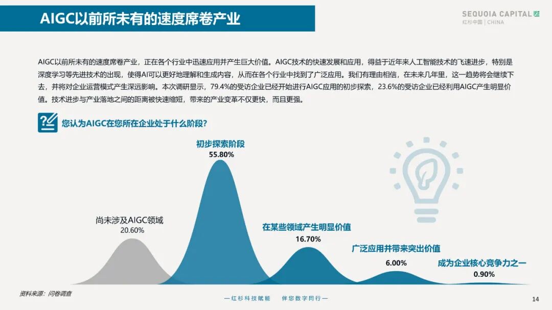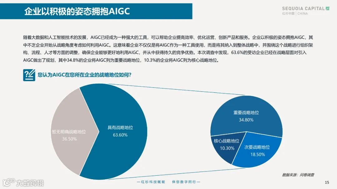 以AIGC(人工智能生成内容)为代表的新技术在2023年为数字化和科技赋能工作注入新活力。AIGC相关应用以惊人的速度在几个月内快速渗透到不同行业的各种场景和领域,引起产业方、学术界、立法监管部门等单位共同关注和讨论。特别的,63.5%企业已经把AIGC列入企业发展战略之中,更大的价值值得期待。