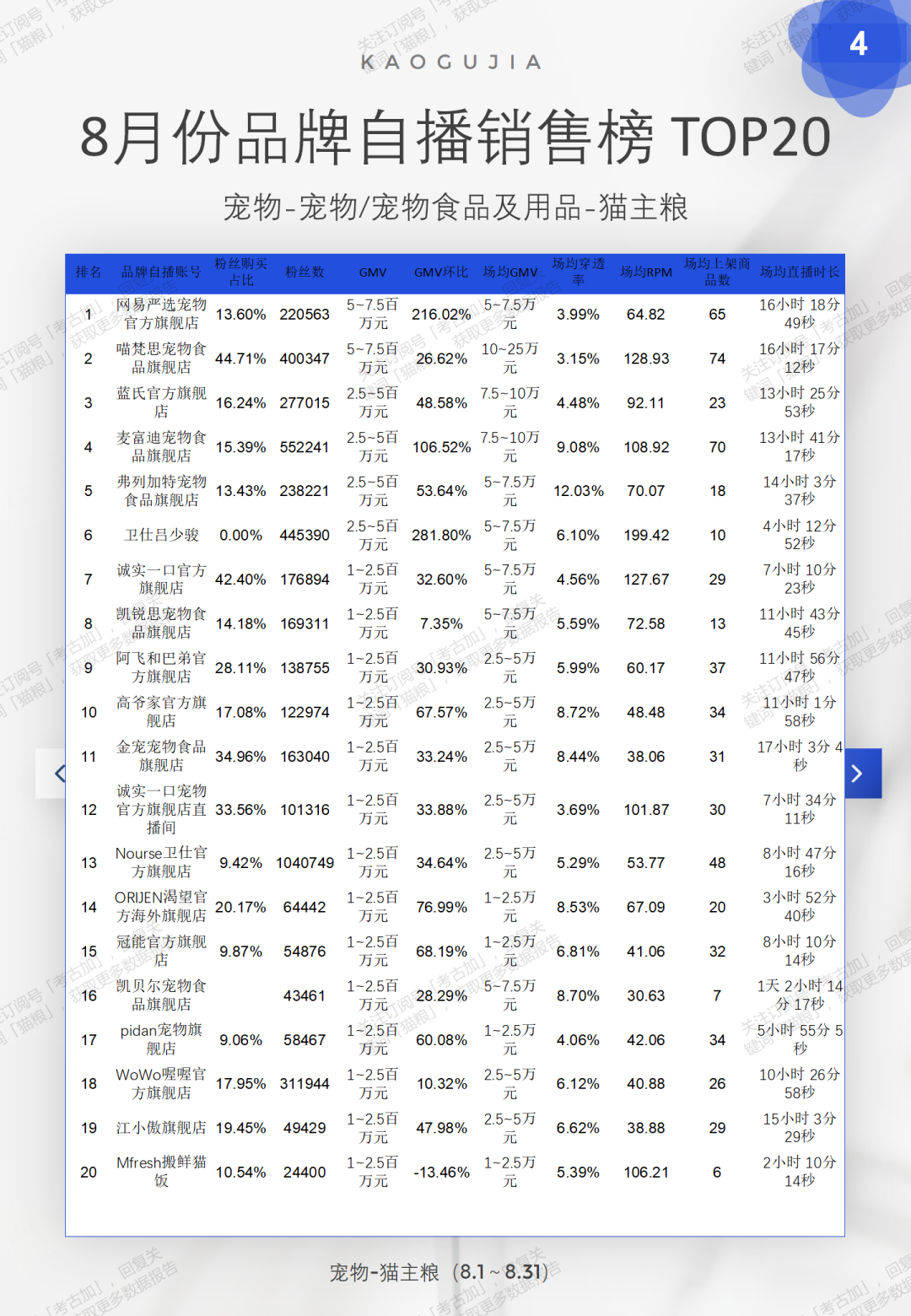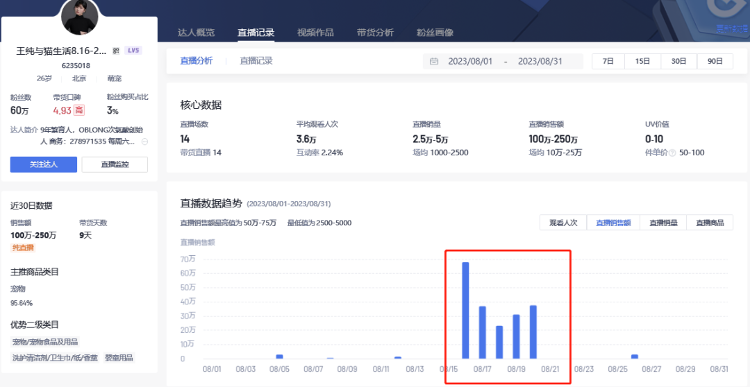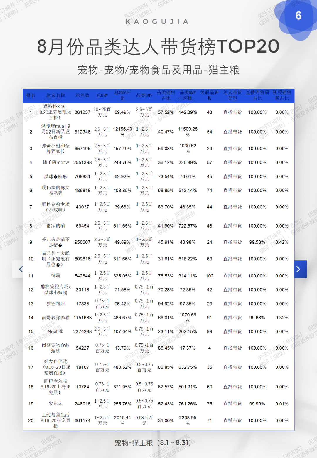 8月亚宠展期间,达人王纯与猫生活直播销售额飞速上涨,相较7月8月销售额环比上涨2238.95%,为其带来一定销量及涨粉量直接进入猫主粮带货榜,如果达人想要在猫品类销售额有质的飞跃,建议尝试参加此类的宠物展做直播。