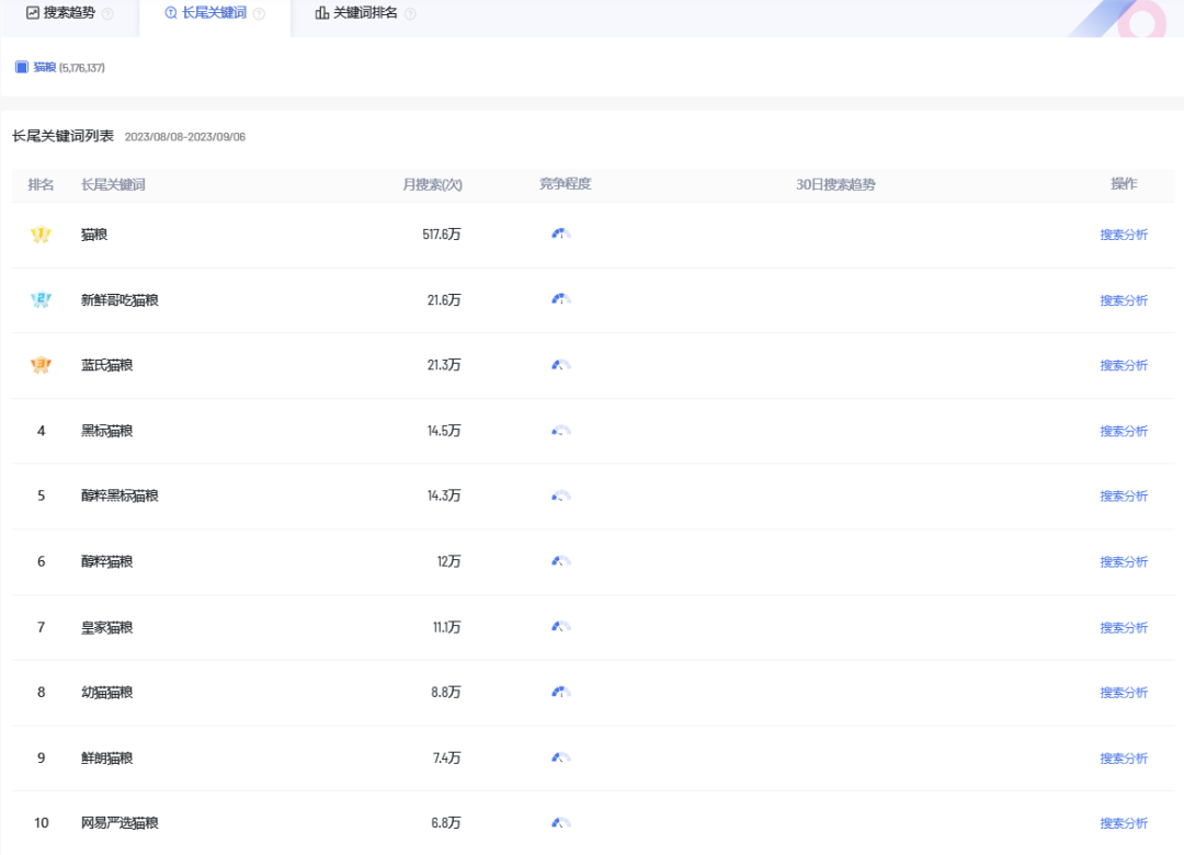 考古加SEO搜索功能显示,「猫粮」相关关键词前10名搜索量基本为国产猫粮品牌,如蓝氏、醇粹等。