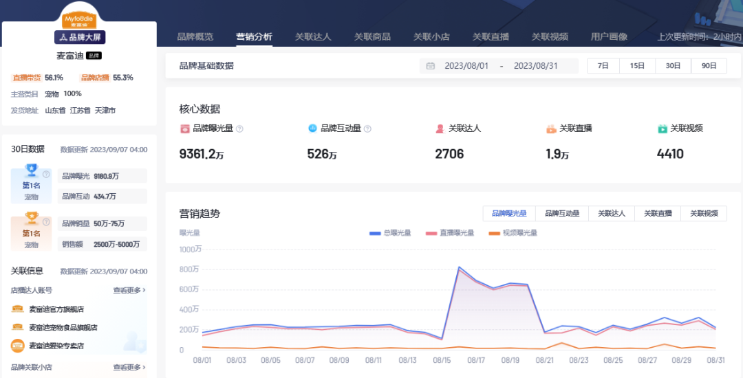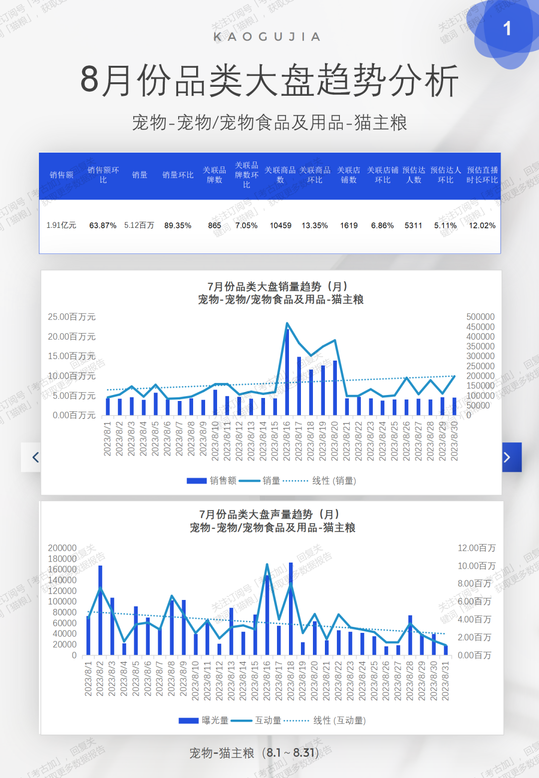 受亚宠展影响,8月16日-8月20日,销量、曝光量有明显上涨趋势,猫粮品牌可多参与此类宠物展,以增加品牌曝光量增加大众认知度,同时一定程度上也可以提高品牌销售额。