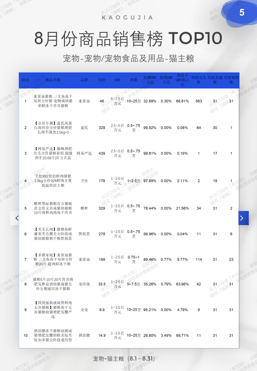 宠物知识类科普类博主,如猫格格、柿子菌meow等先用视频对猫粮选购进行基本知识介绍以获取消费者信任,在以直播形式对猫粮再次介绍以提高成交率。