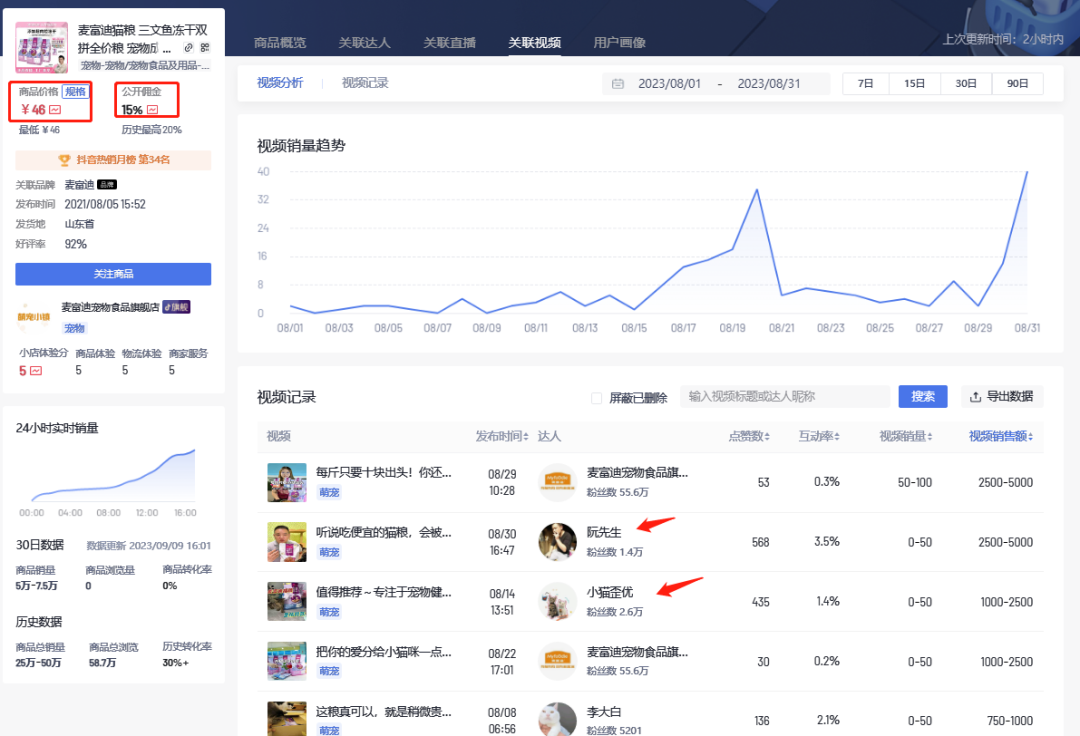再找近百位尾部+腰部达人以低价款猫粮进行视频种草及直播带货,铺设声量增加曝光量,触达目标人群实现成交转化。