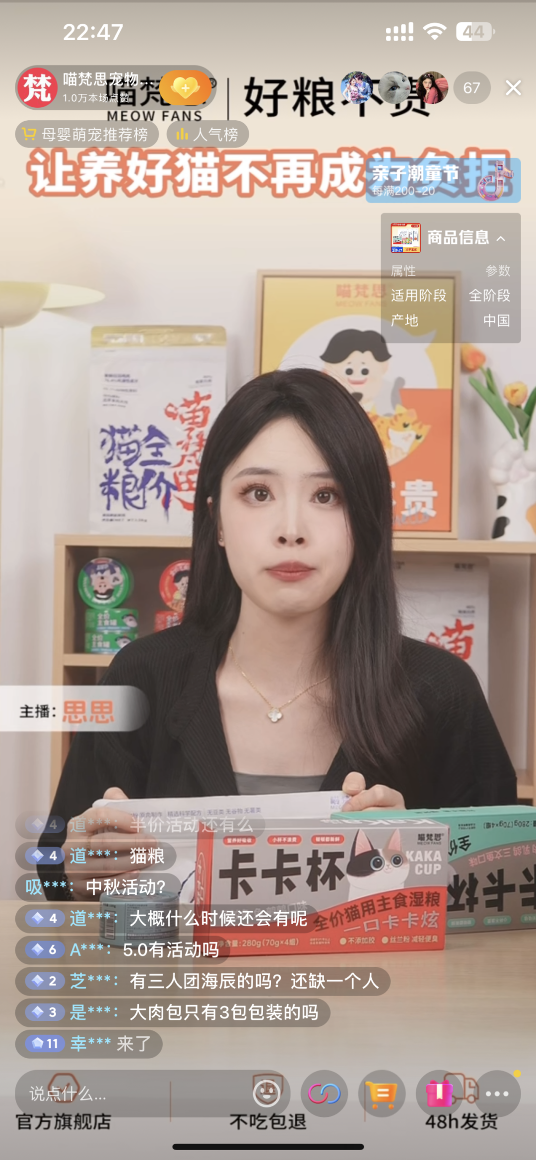 直播间再以一句「让养好猫不再成为负担」,精准打中养宠人群痛点吸引其进入直播间,符合养宠人群心理的直播场景搭建、直播话术、产品选择及活动,让不少已是精准用户的粉丝为其买单。