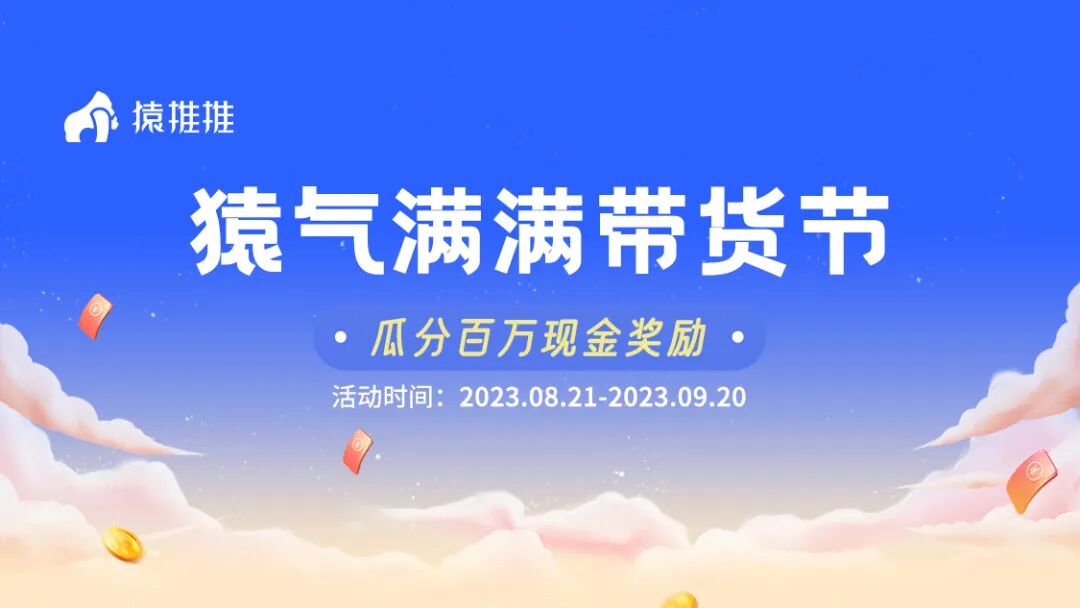猿推推在这元气满满的8月,重磅推出“猿气满满”带货节活动,百万现金奖励,卖的越多,奖励越多,奖励无上限。还可叠加最高18888元带货王PK排名奖,带货之王就是你!