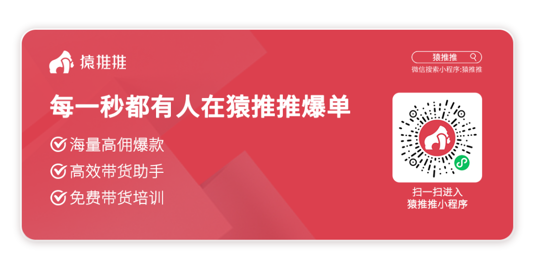 本次“猿气满满”带货节活动,猿推推倾力为达人们提供最完善的带货服务,高佣爆品+投流机制+百万现金奖励,实现带货爆单,就差一个你了。