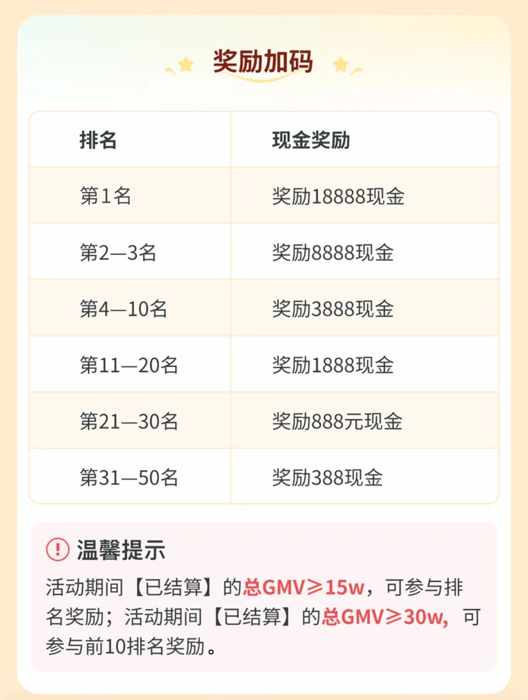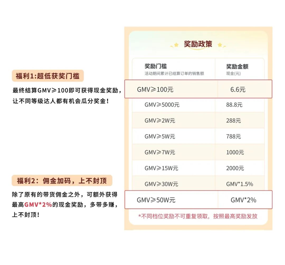 为了让更多达人享受到本次奖励,还降低了奖励门槛,GMV≥100即可参与奖金瓜分,百万现金奖励有你一份。
