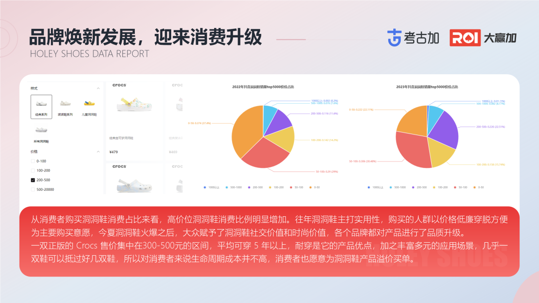 从消费者购买洞洞鞋消费占比来看,高价位洞洞鞋消费比例明显增加。往年洞洞鞋主打实用性,购买的人群以价格低廉穿脱方便为主要购买意愿,今夏洞洞鞋火爆之后,大众赋予了洞洞鞋社交价值和时尚价值,各个品牌都对产品进行了品质升级。