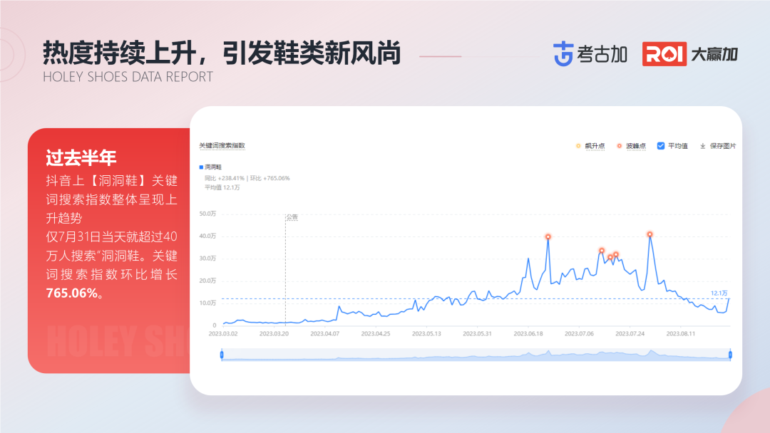 过去半年抖音上【洞洞鞋】关键词搜索指数整体呈现上升趋势。仅7月31日当天就超过40万人搜索“洞洞鞋。关键词搜索指数环比增长765.06%。