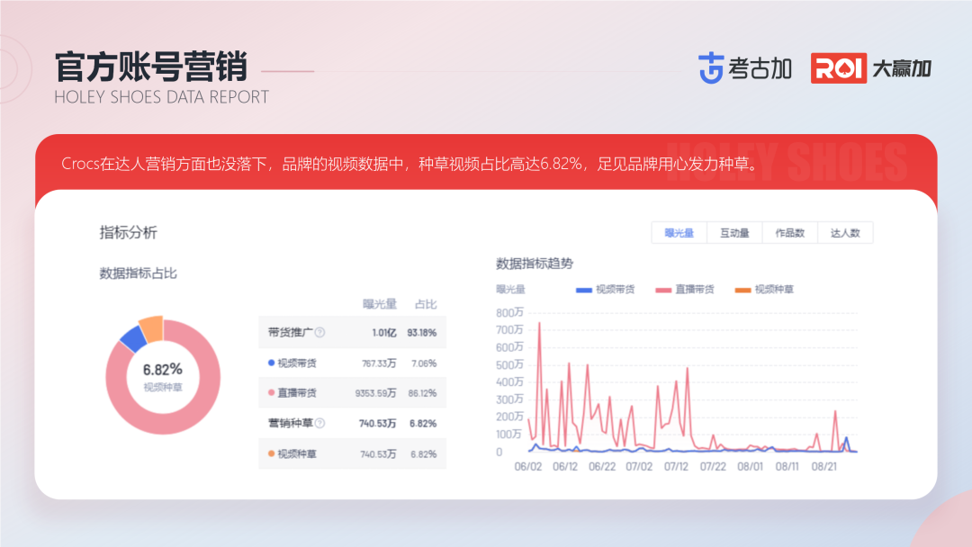 Crocs在达人营销方面也没落下,品牌的视频数据中,种草视频占比高达6.82%,足见品牌用心发力种草。